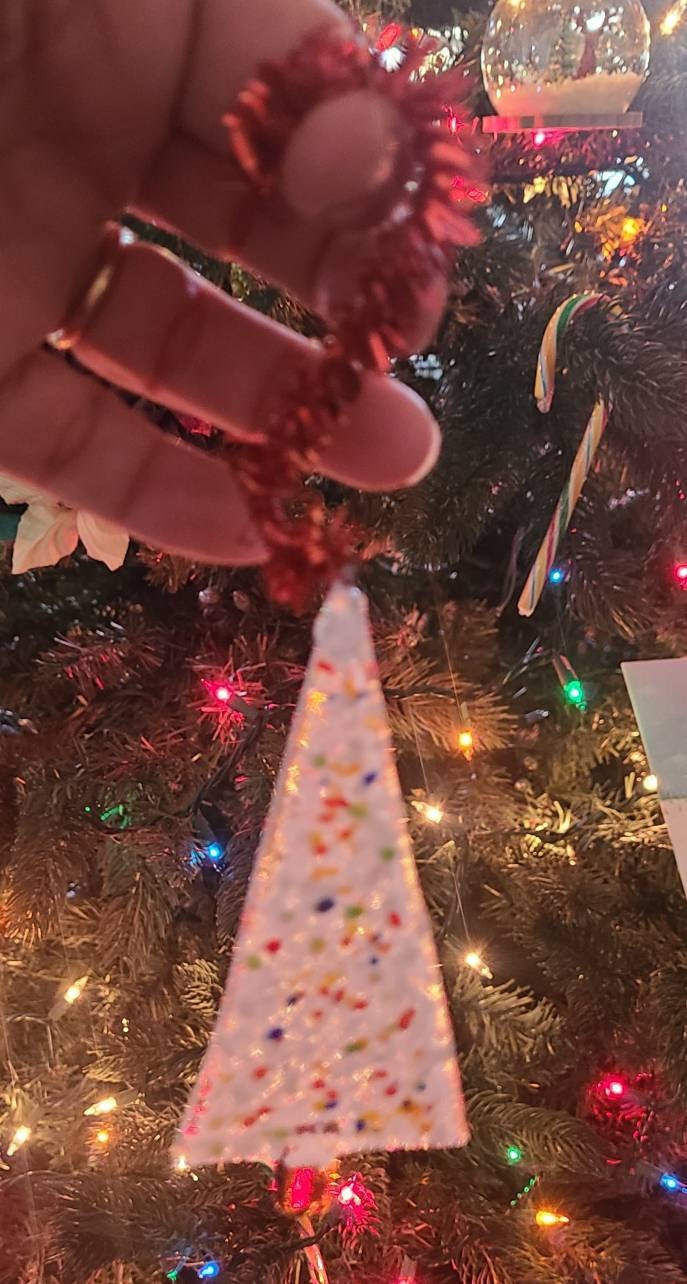 I cut the Christmas tree from clear glass then add white and colorful frit. The ornament is then fired at a high temperature making the glass permanent.